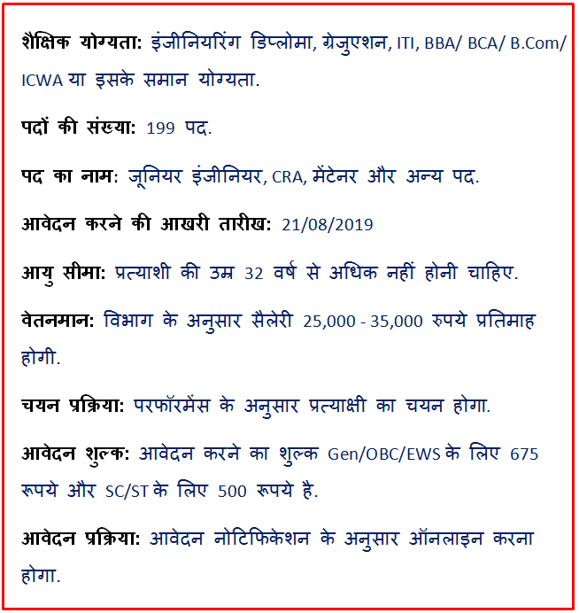 - Number of Posts: 199 Posts Name of the post: Junior Engineer, CRA, Container and other posts.