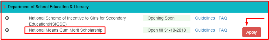 - उसके बाद National Means Cum Merit Scholarship यह विकल्प आपके सामने आएगा, उसके आगे Apply का विकल्प दिखाई देगा, उसपे क्लिक करे।